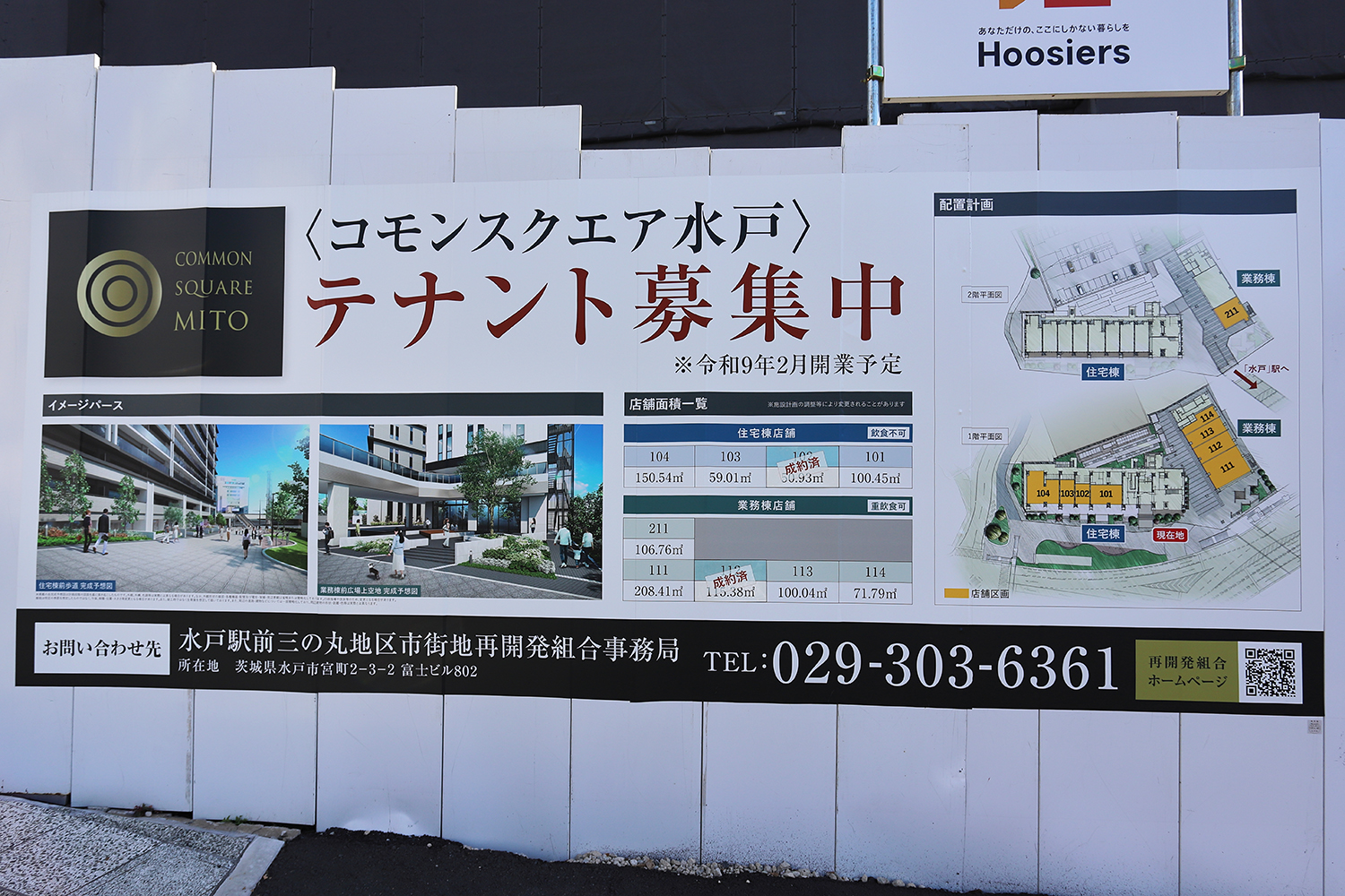 「コモンスクエア水戸」のテナント(店舗)を募集中でした。 住宅棟1階4区画、業務棟1階4区画、2階1区画が募集対象で、このうち2区画が成約済でした。 このほか業務棟には事務所3区画が整備されます。 写真クリックで拡大画像を表示。