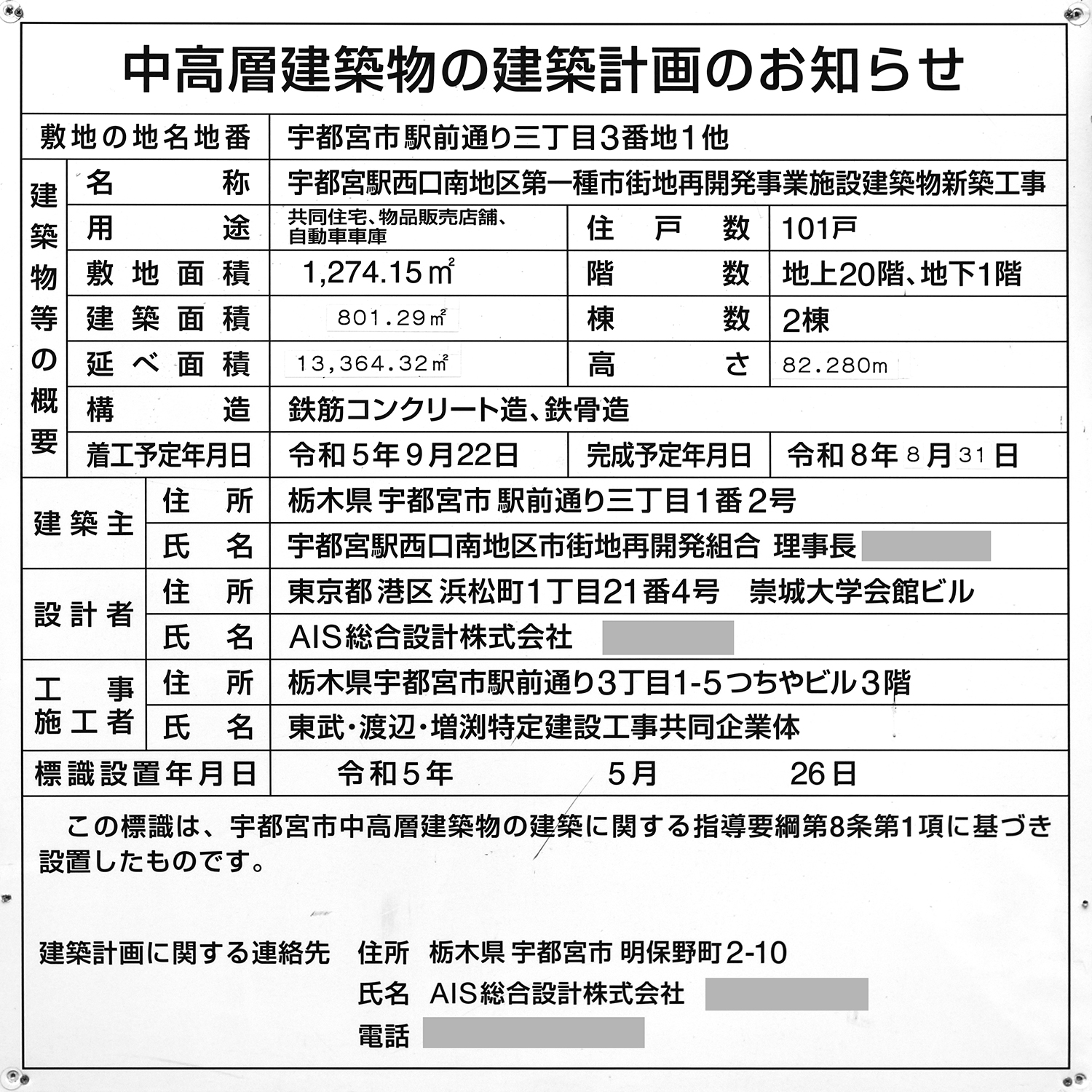 「アトラスタワー宇都宮」の建築計画のお知らせ。前回撮影時と内容は同じです。写真クリックで拡大画像を表示。