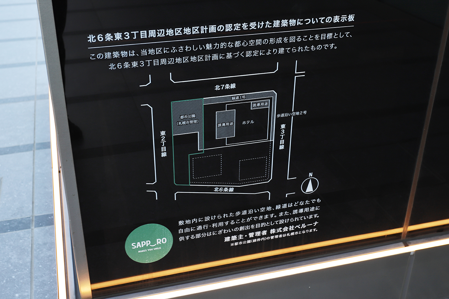 「北6条東3丁目周辺地区地区計画の認定を受けた建築物についての標示板」がありました。写真クリックで拡大画像を表示。