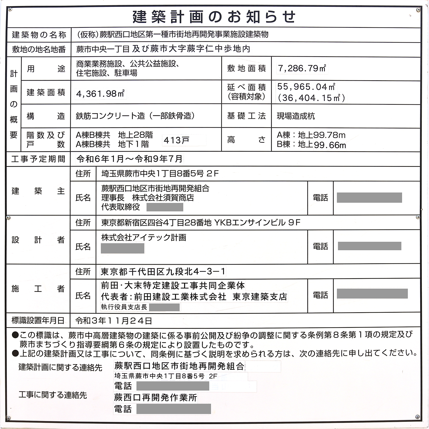 「蕨駅西口地区第一種市街地再開発事業」の建築計画のお知らせ。 前回撮影時と比較すると、地名地番、延べ面積、容積対象延べ面積、戸数(415戸→413戸)が修正されていました。 写真クリックで拡大画像を表示。
