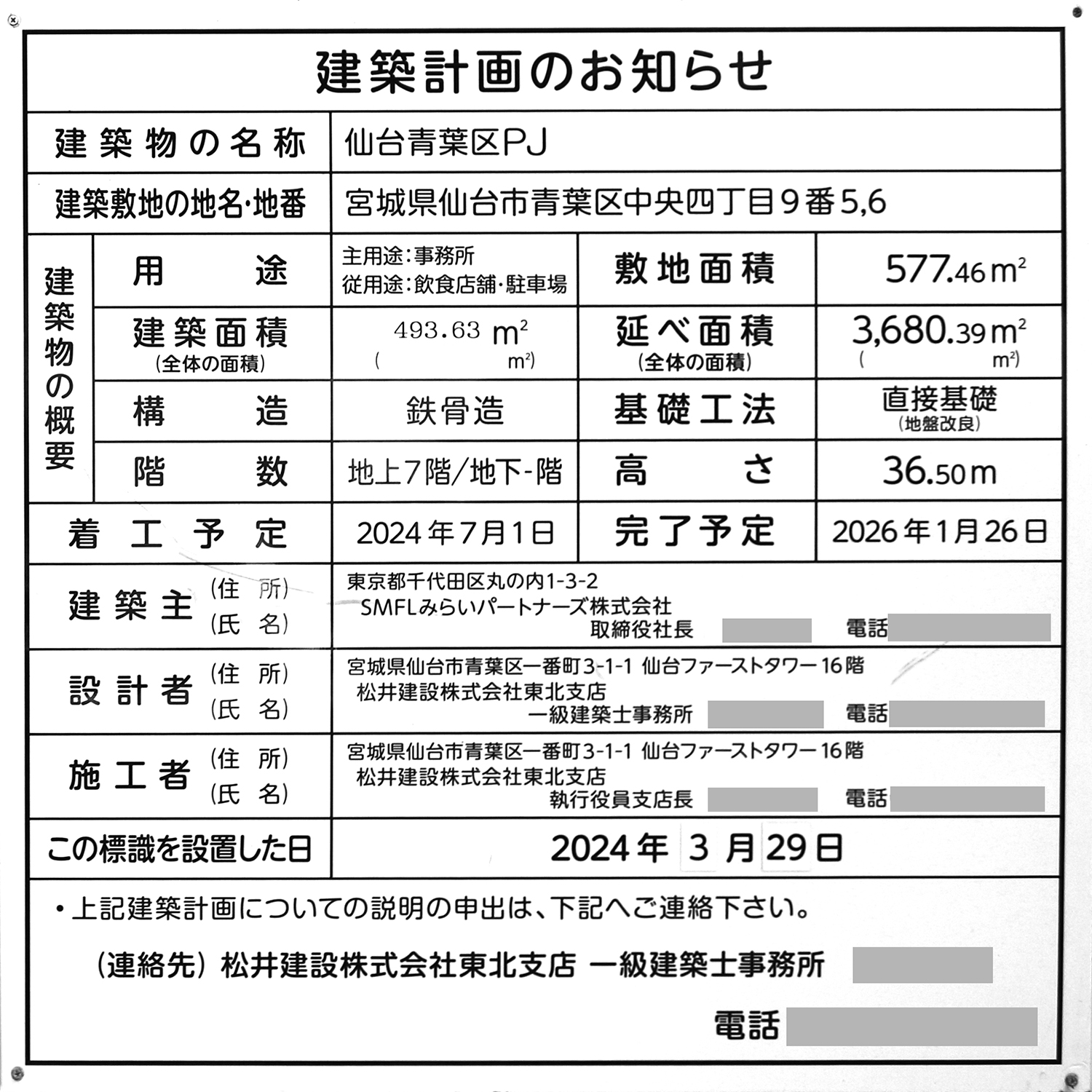 その左手。地上7階、高さ36.50m、延べ面積3,680㎡の飲食店舗併設オフィスビルを建設する「仙台青葉区PJ」が進行中でした。