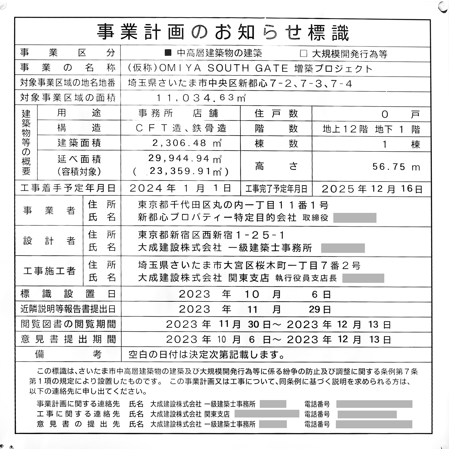 「(仮称)OMIYA SOUTH GATE 増築プロジェクト」の建築計画のお知らせ。前回撮影時と内容は同じです。写真クリックで拡大画像を表示。