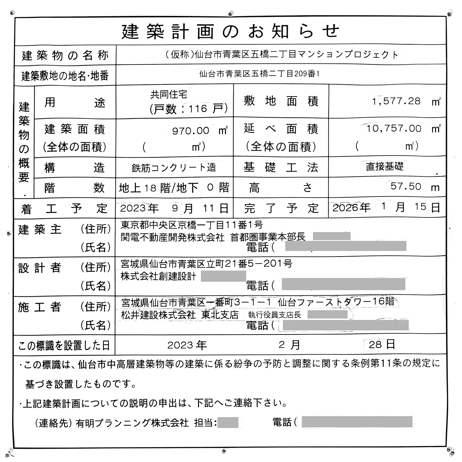計画名 | 仙台五橋仙台駅徒歩圏・青葉区五橋・大規模免震マンション (仮称)仙台市青葉区五橋二丁目マンションプロジェクト |