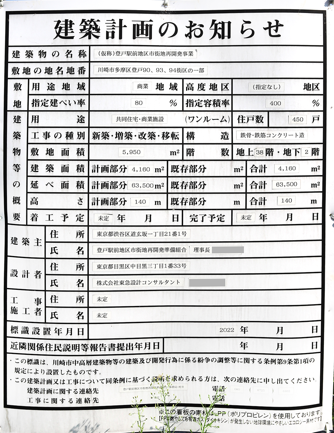 「登戸駅前地区第一種市街地再開発事業」の建築計画のお知らせ。前回撮影時と内容は同じです。写真クリックで拡大画像を表示。