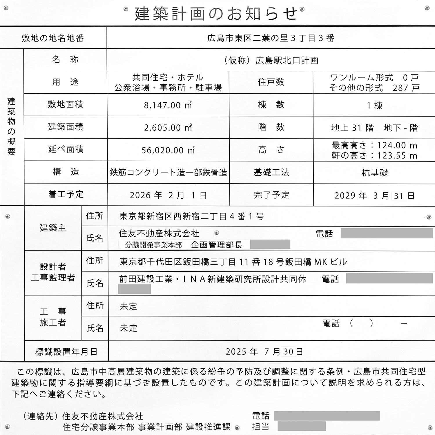 住友不動産は、JR広島駅北口の二葉の里地区(広島市東区)に、共同住宅、ホテル、公衆浴場、事務所、駐車場で構成する地上31階、高さ124m、延べ面積56,020㎡の複合ビルを新設します。 設計は前田建設工業・INA新建築研究所JV。 2026年2月に着工し、2029年3月に竣工する予定です。