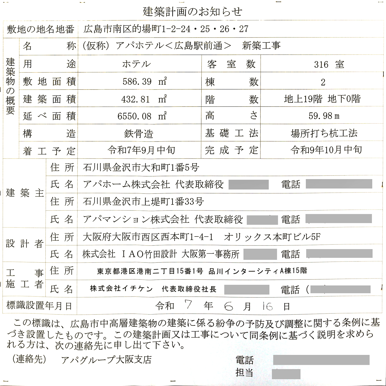 「(仮称)アパホテル〈広島駅前〉」の建築計画のお知らせ。設計は日企設計、施工は熊谷組です。写真クリックで拡大画像を表示。