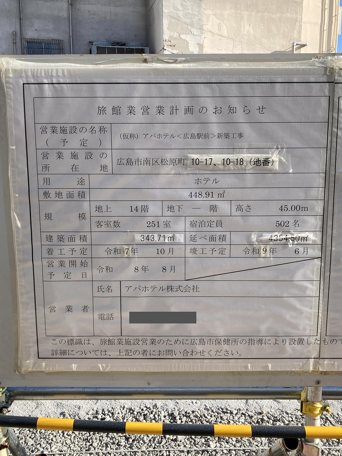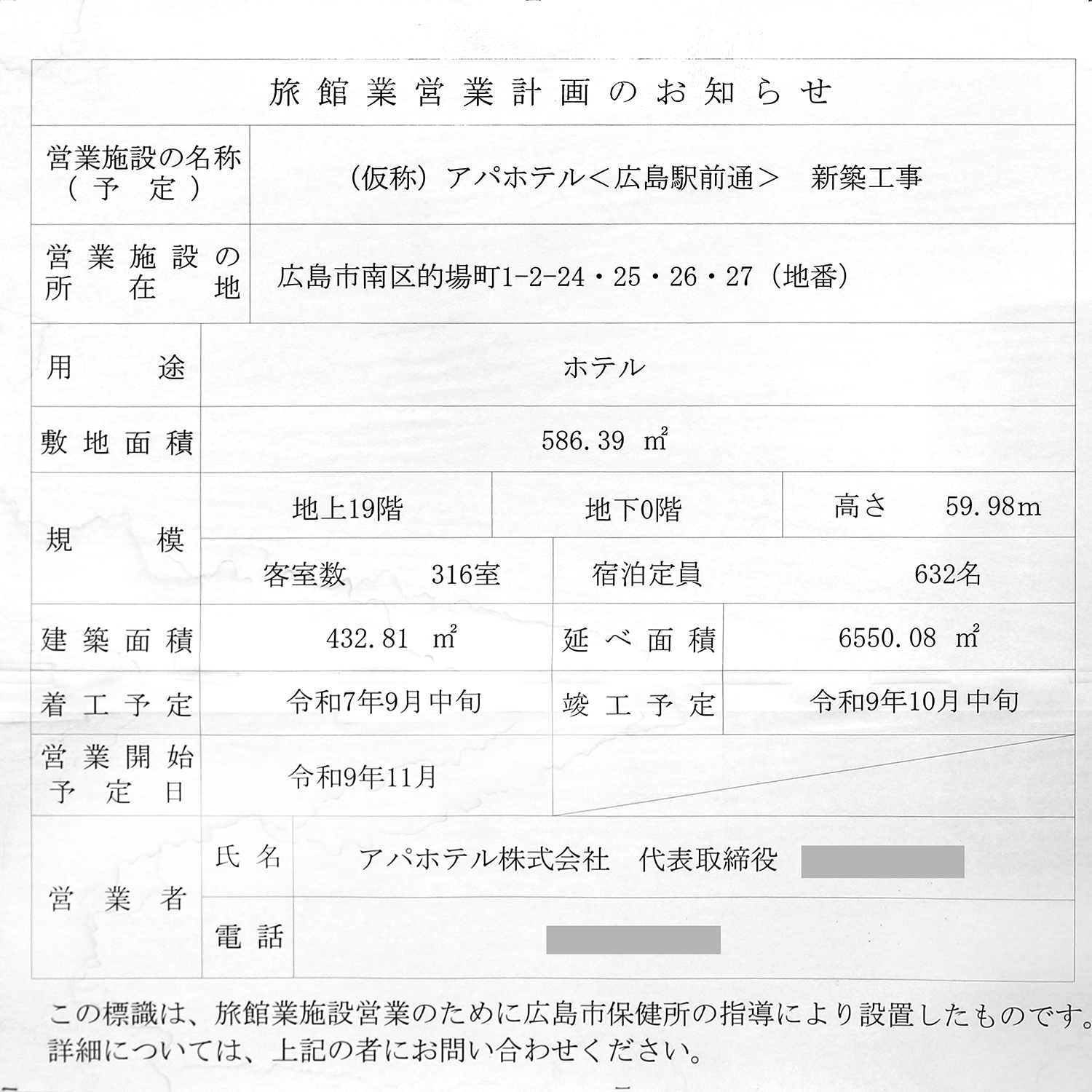 「(仮称)アパホテル〈広島駅前通〉」の旅館業営業計画のお知らせです。