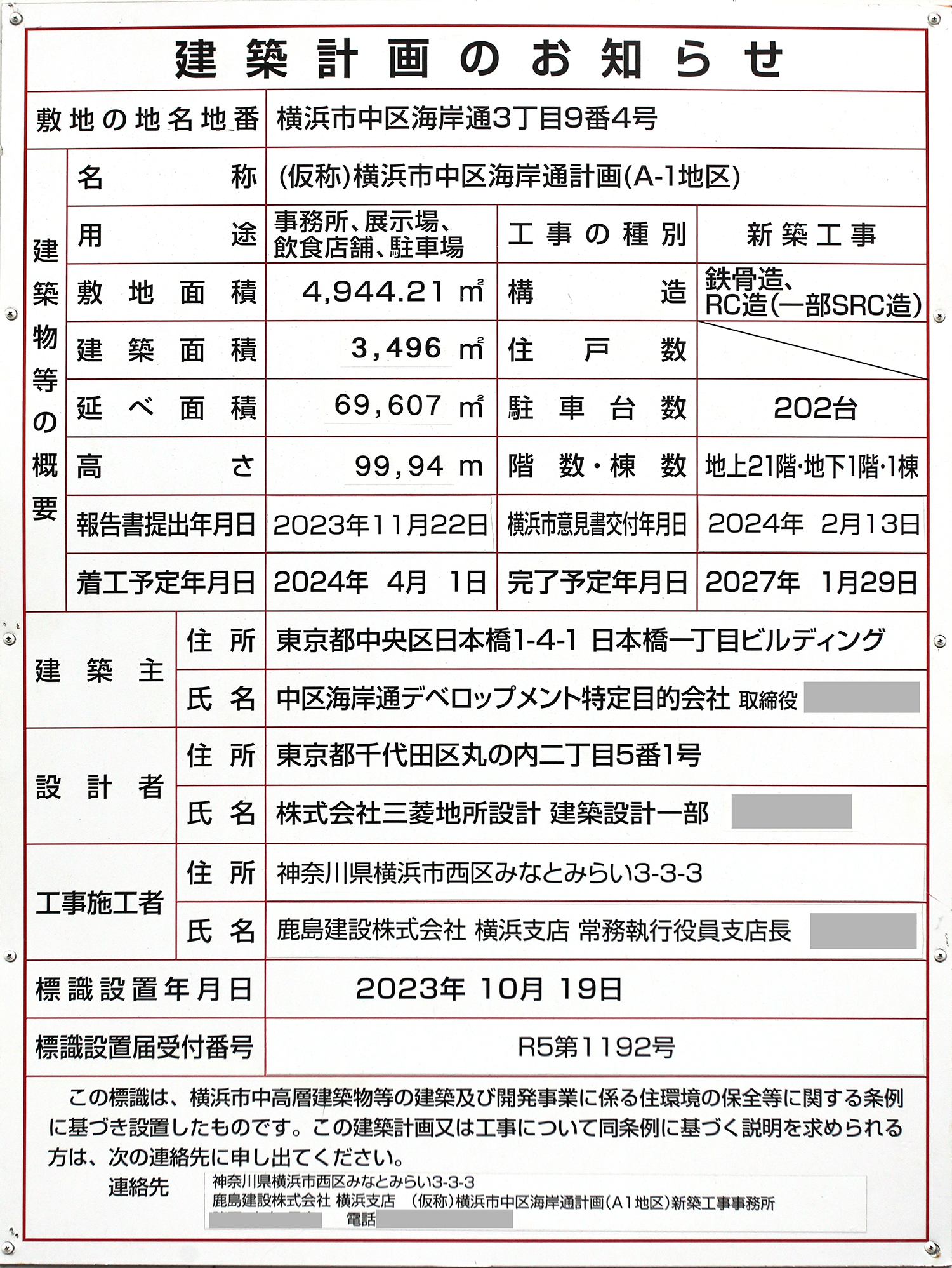 「(仮称)横浜市中区海岸通計画(A-1地区)」の建築計画のお知らせ。 前回撮影時に99.99mだった高さが99.94mに変更されたほか、建築面積と延べ面積が修正されています。