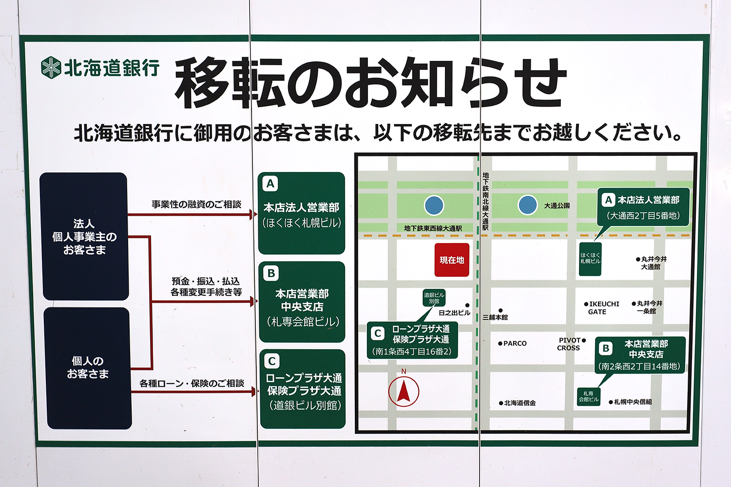 北海道銀行の各部署は近隣に移転しています。写真クリックで拡大画像を表示。