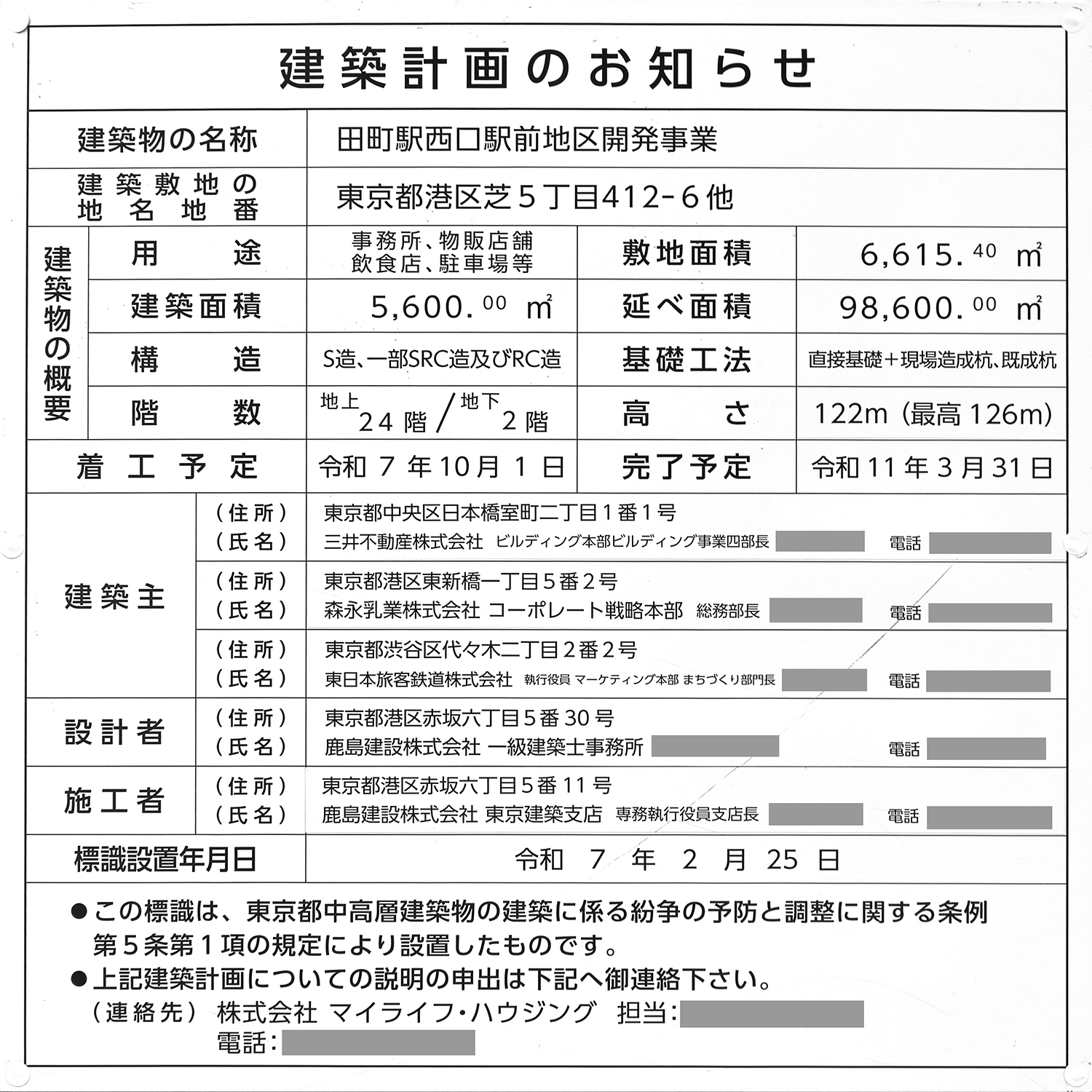 三井不動産、森永乳業、JR東日本の3社は、田町駅・三田駅前(東京都港区芝5丁目)に、事務所、店舗、産業支援施設で構成する地上24階、地下2階、高さ約125m、延べ面積98,570㎡の超高層ビルを新設します。 設計・施工は鹿島建設。 2025年10月1日に着工しました。 1期工事として2029年3月末に建物が竣工します。 2期工事として2033年度に緑地広場の整備を実施し、全体竣工を迎える予定です。