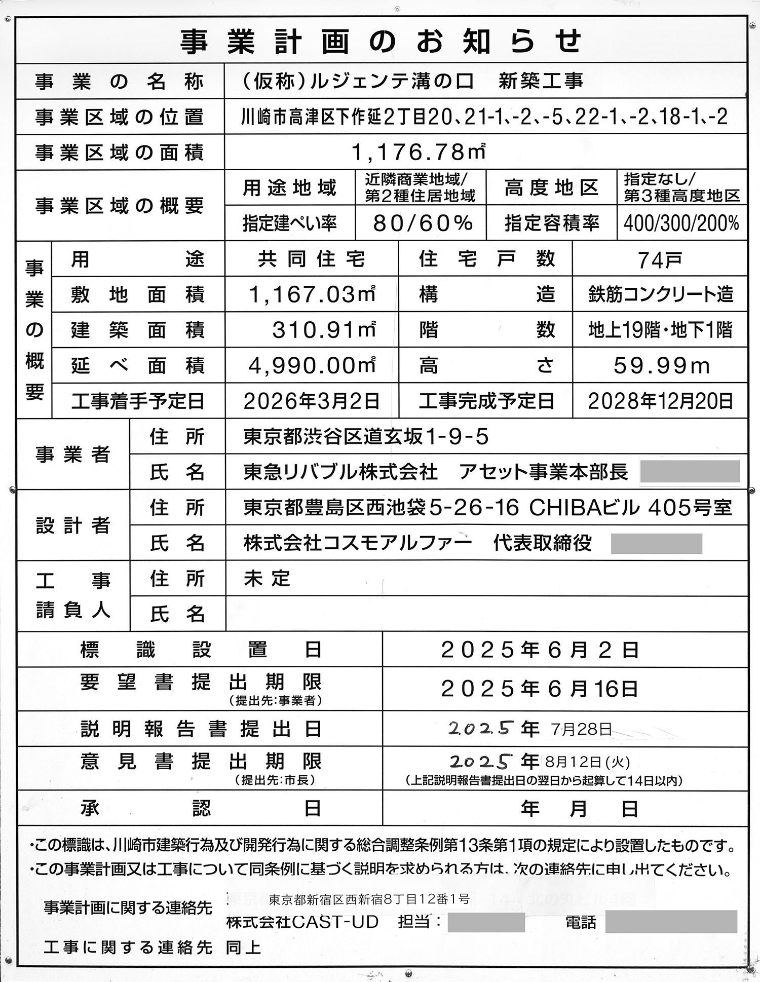 「(仮称)ルジェンテ溝の口新築工事」の事業計画のお知らせ。2025年6月2日に設置されています。高さは59.99mです。