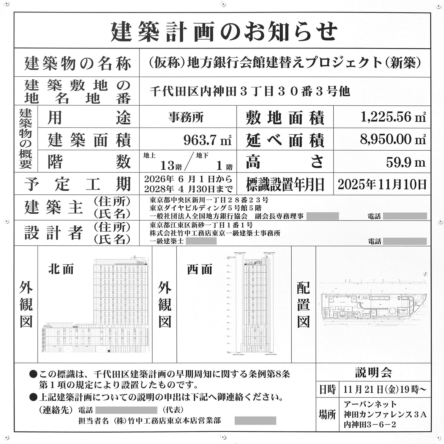千代田区の条例による「(仮称)地方銀行会館建替えプロジェクト」の建築計画のお知らせ。2025年11月10日に設置されています。写真クリックで拡大画像を表示。