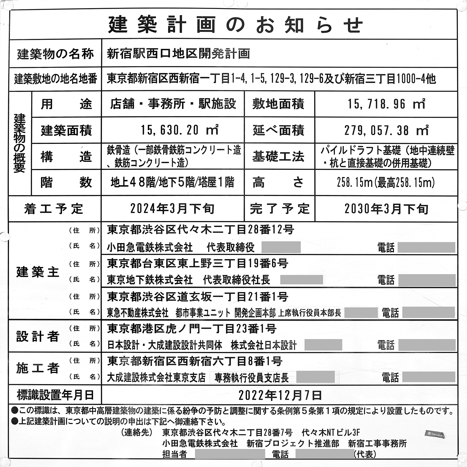 「新宿駅西口地区開発計画」の建築計画のお知らせ。前回撮影時と内容は同じです。写真クリックで拡大画像を表示。