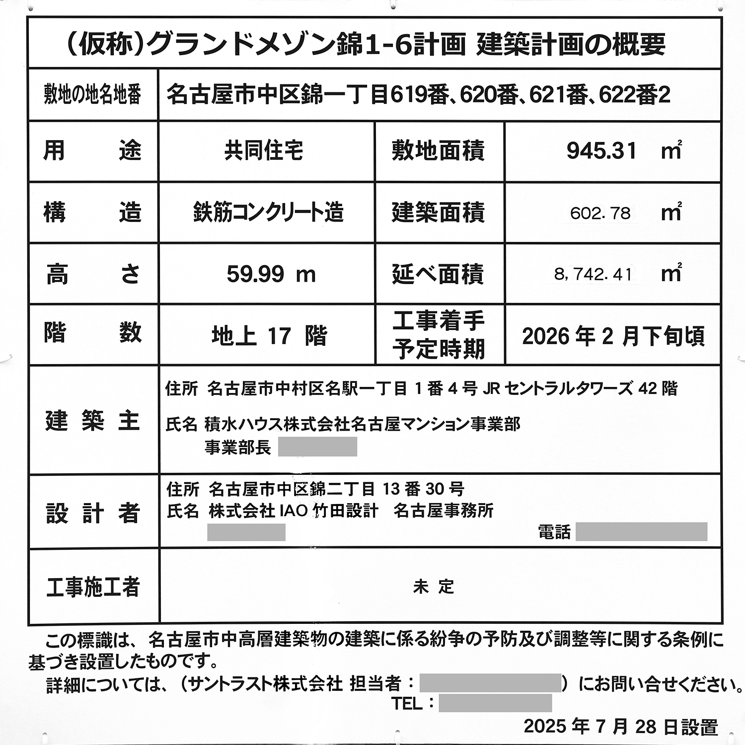 「(仮称)グランドメゾン錦1-6計画」の建築計画の概要。2026年2月下旬頃に着工する予定です。写真クリックで拡大画像を表示。