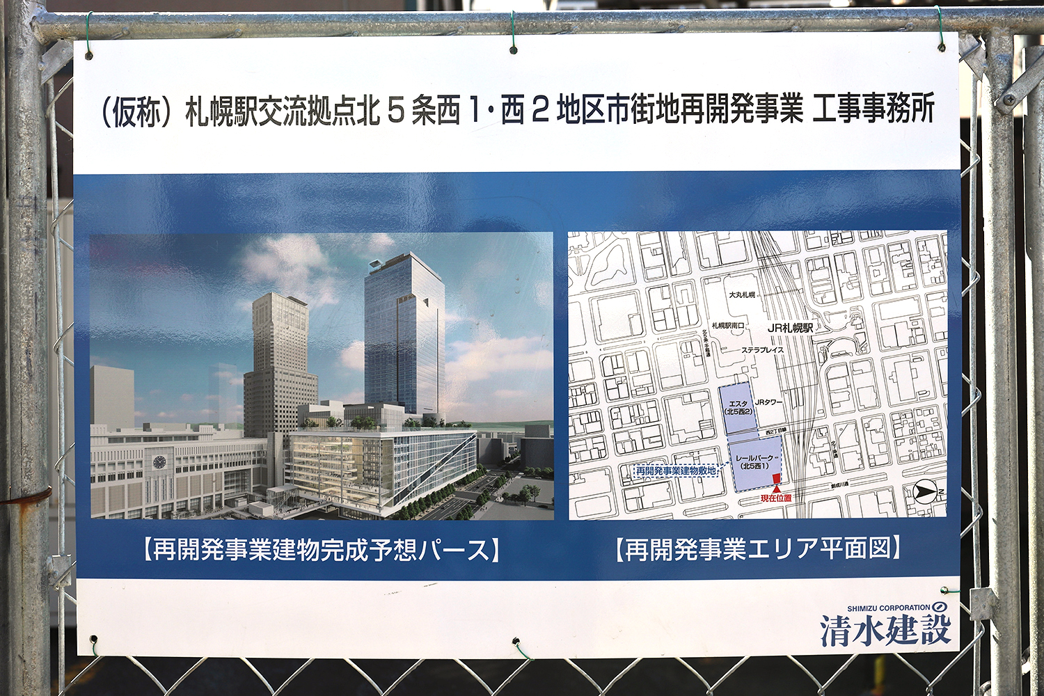 札幌駅交流拠点北5西1・西2地区市街地再開発組合は、JR札幌駅南口に商業施設、オフィス、ホテル(2ブランド)、展望施設、バスターミナルなどで構成する地上43階、地下4階、高さ約245m、延べ面積約386,700㎡の超高層ビルを新設します。 設計は日本設計・清水建設JV、施工は清水建設・伊藤組土建・岩田地崎建設・札建工業・泰進建設JV。 2026年度の着工、2030年度の竣工を目指していましたが・・・