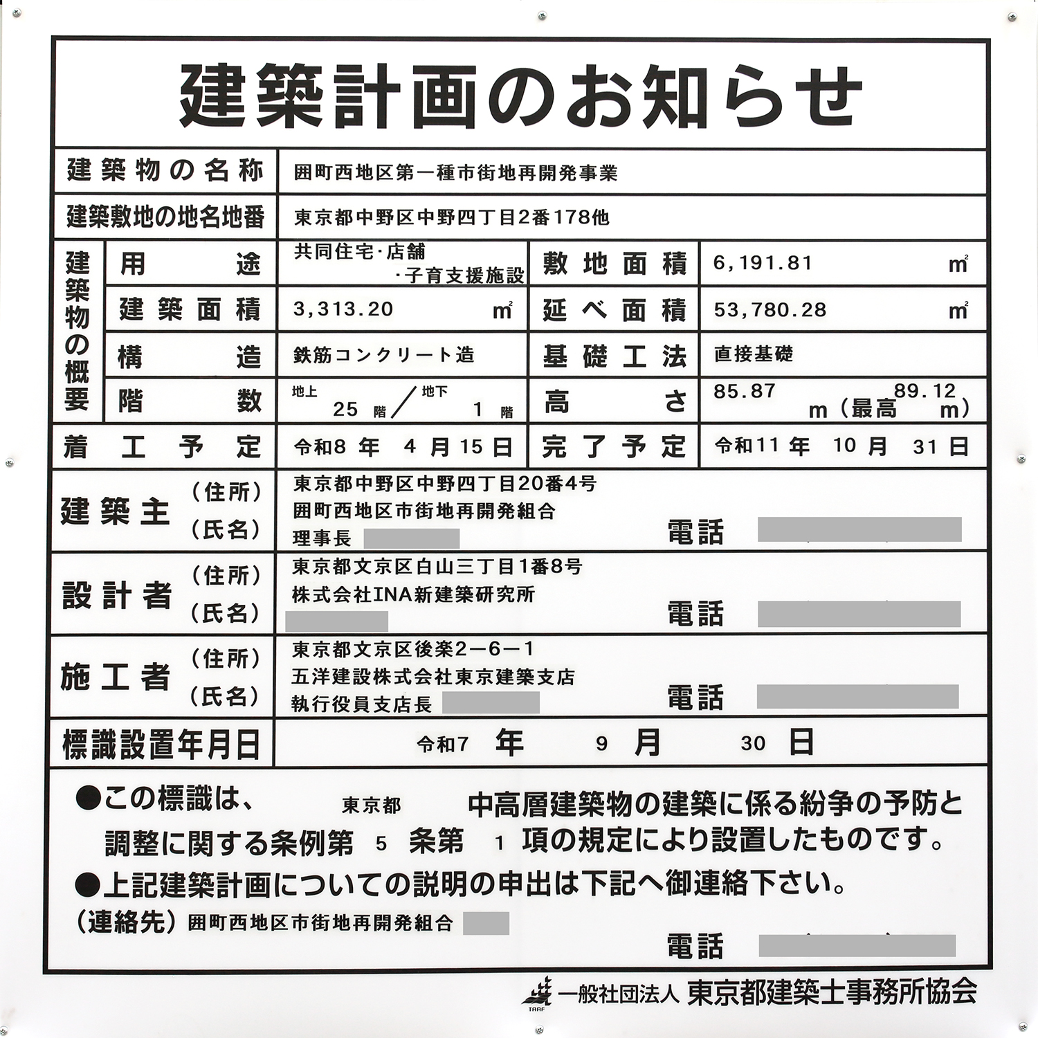 こちらは中野区の条例による「囲町西地区第一種市街地再開発事業」の建築計画のお知らせです。 2026年4月15日に着工し、2029年10月末に竣工する予定です。 写真クリックで拡大画像を表示。