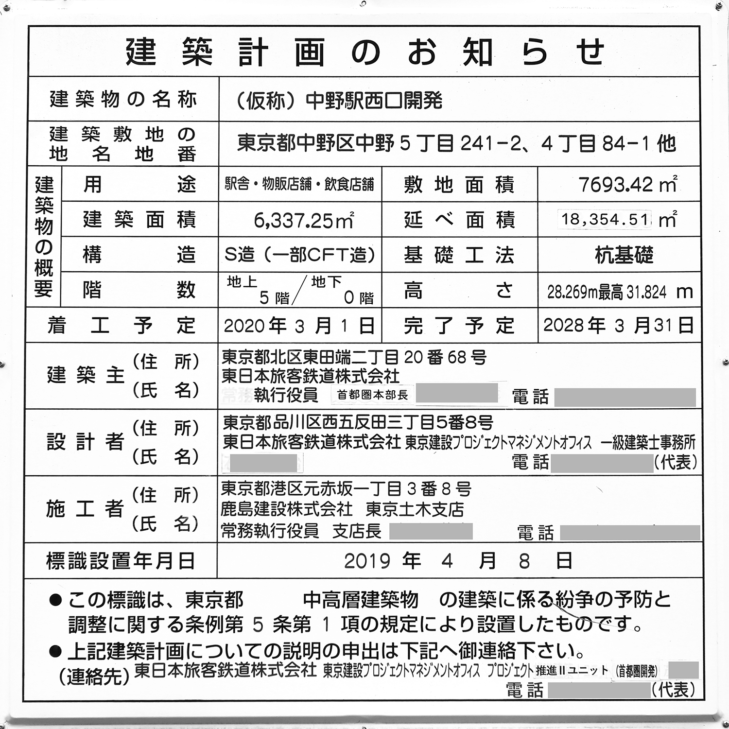 「(仮称)中野駅西口開発 駐車場棟」の建築計画のお知らせも設置されていました。 地上3階、地下1階、高さ18.427m、延べ面積1,457㎡です。 写真クリックで拡大画像を表示。