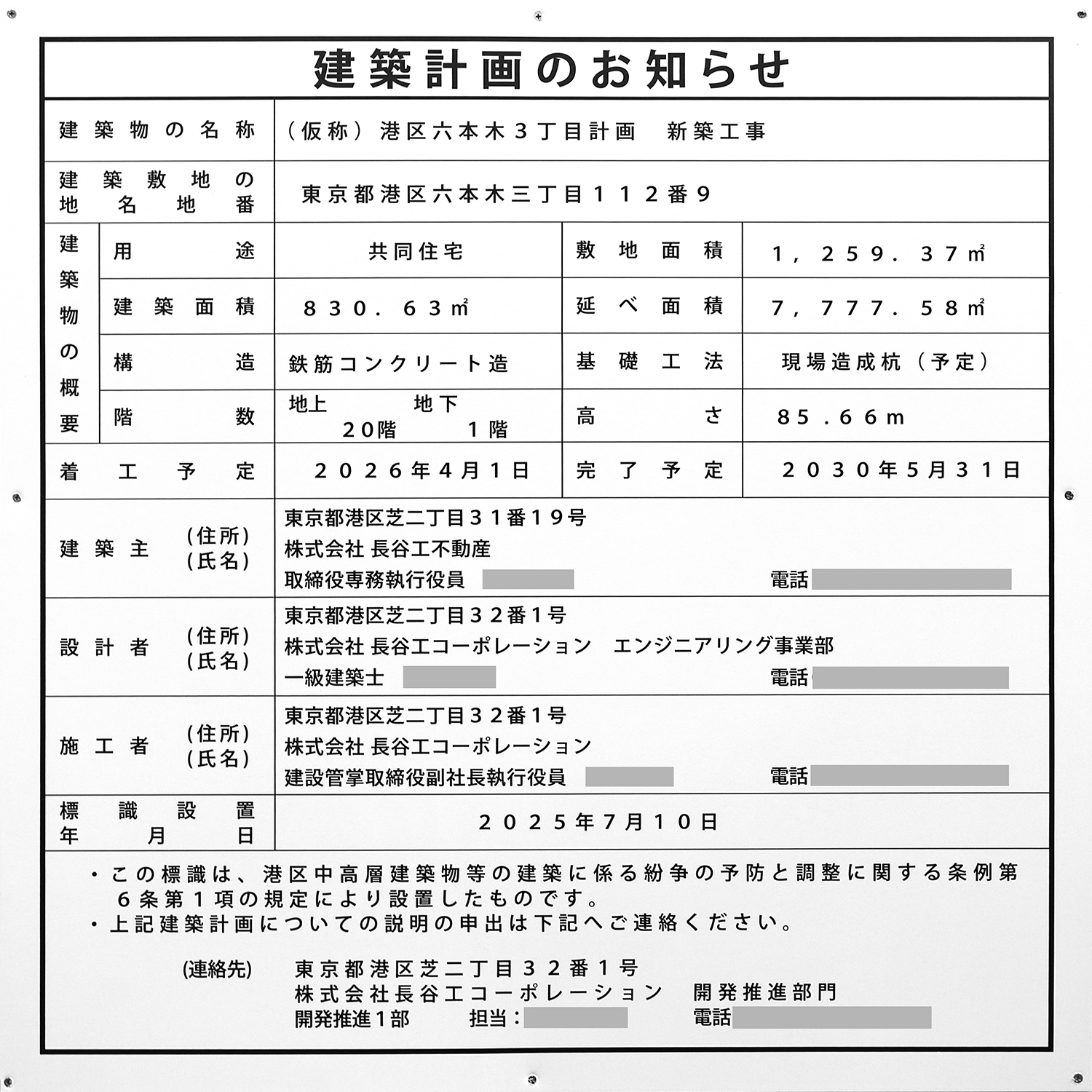 長谷工不動産は、東京都港区六本木3丁目に地上20階、地下1階、高さ85.66m、延べ面積7,777㎡の高層マンションを新設します。 設計・施工は長谷工コーポレーション。 2026年4月に着工し、2030年5月末に竣工する予定です。