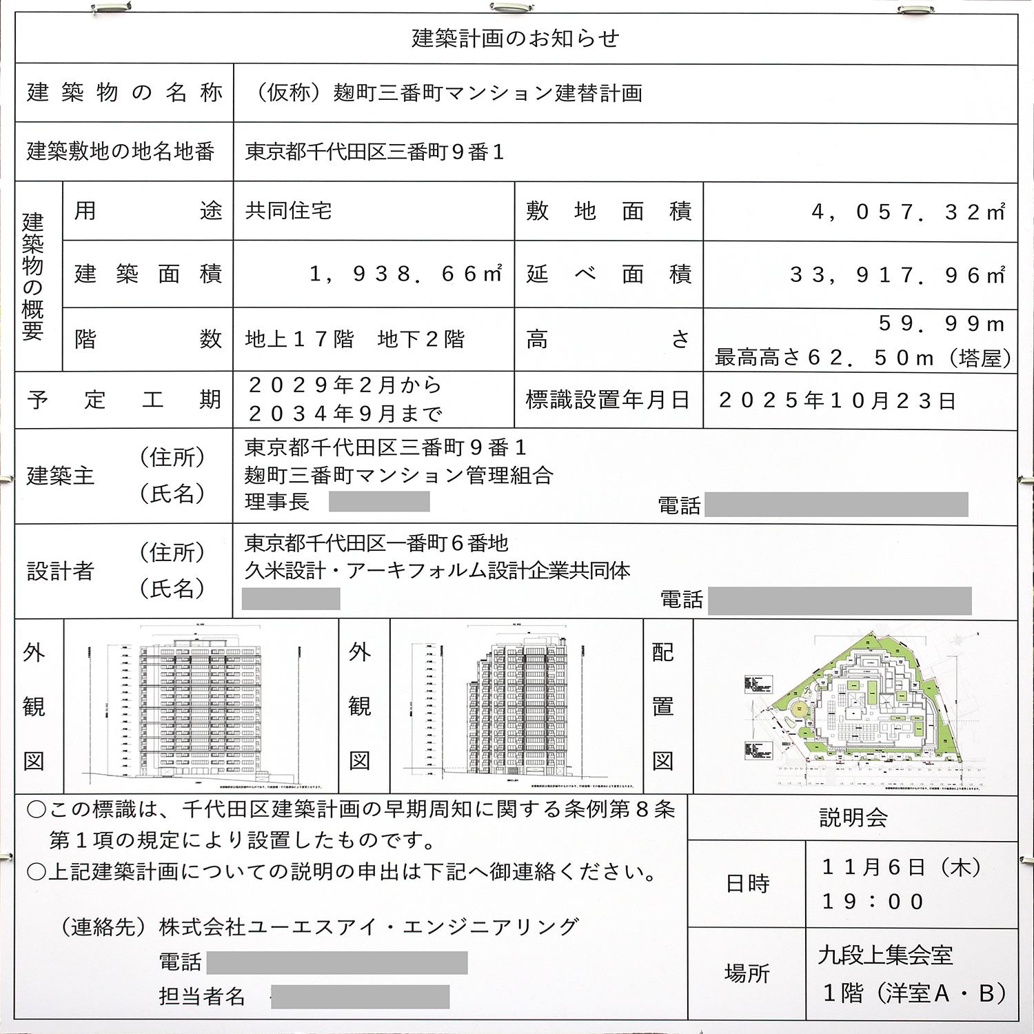 「(仮称)麹町三番町マンション建替計画」の建築計画のお知らせ。 2029年2月に着工し、2034年9月に竣工する予定です。 写真クリックで拡大画像を表示。